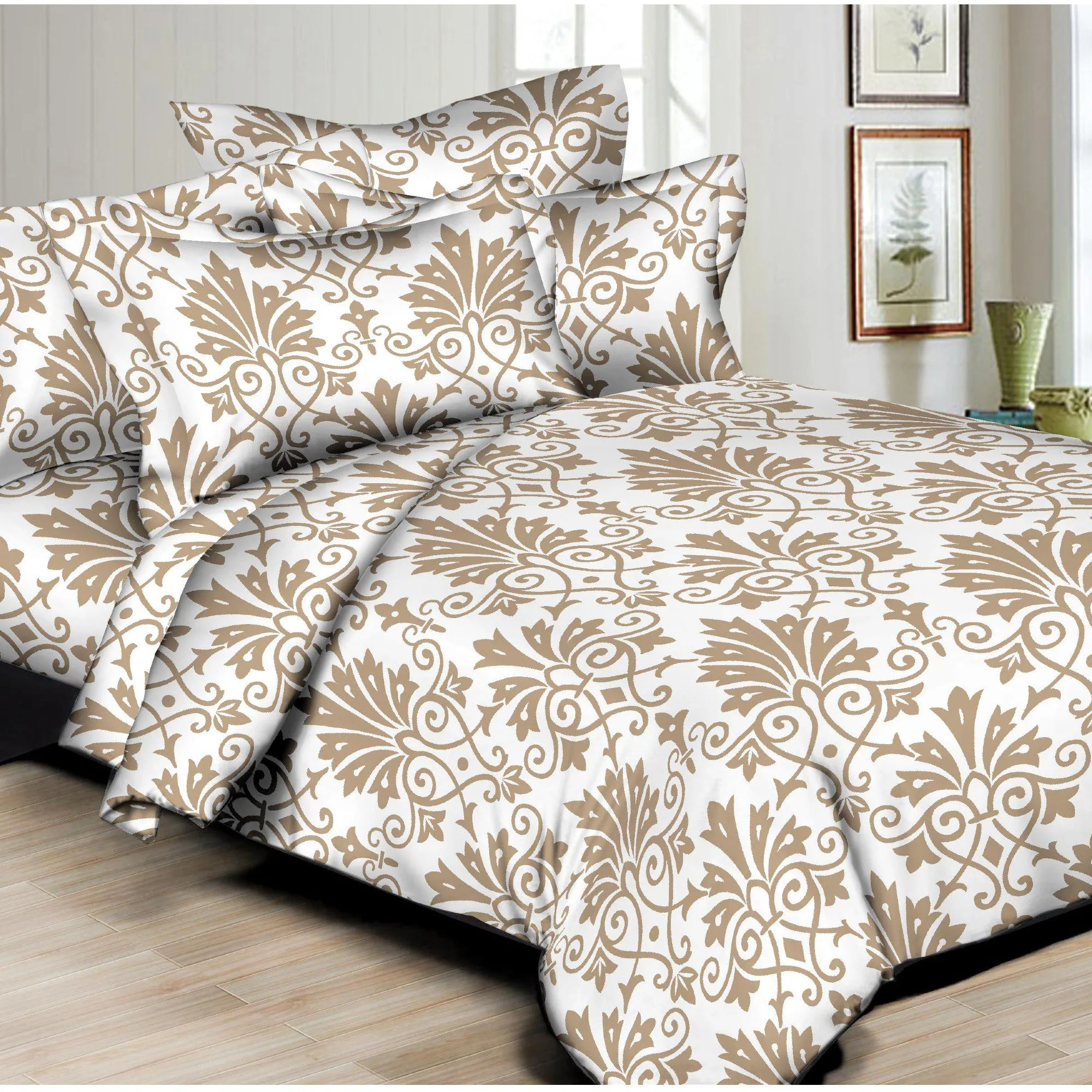 Duvet Set features Beautiful printed design, High quality Poly/Cotton Sateen, 300 thread count, Machine washable, easy care. Button closure at foot of Duvet cover.