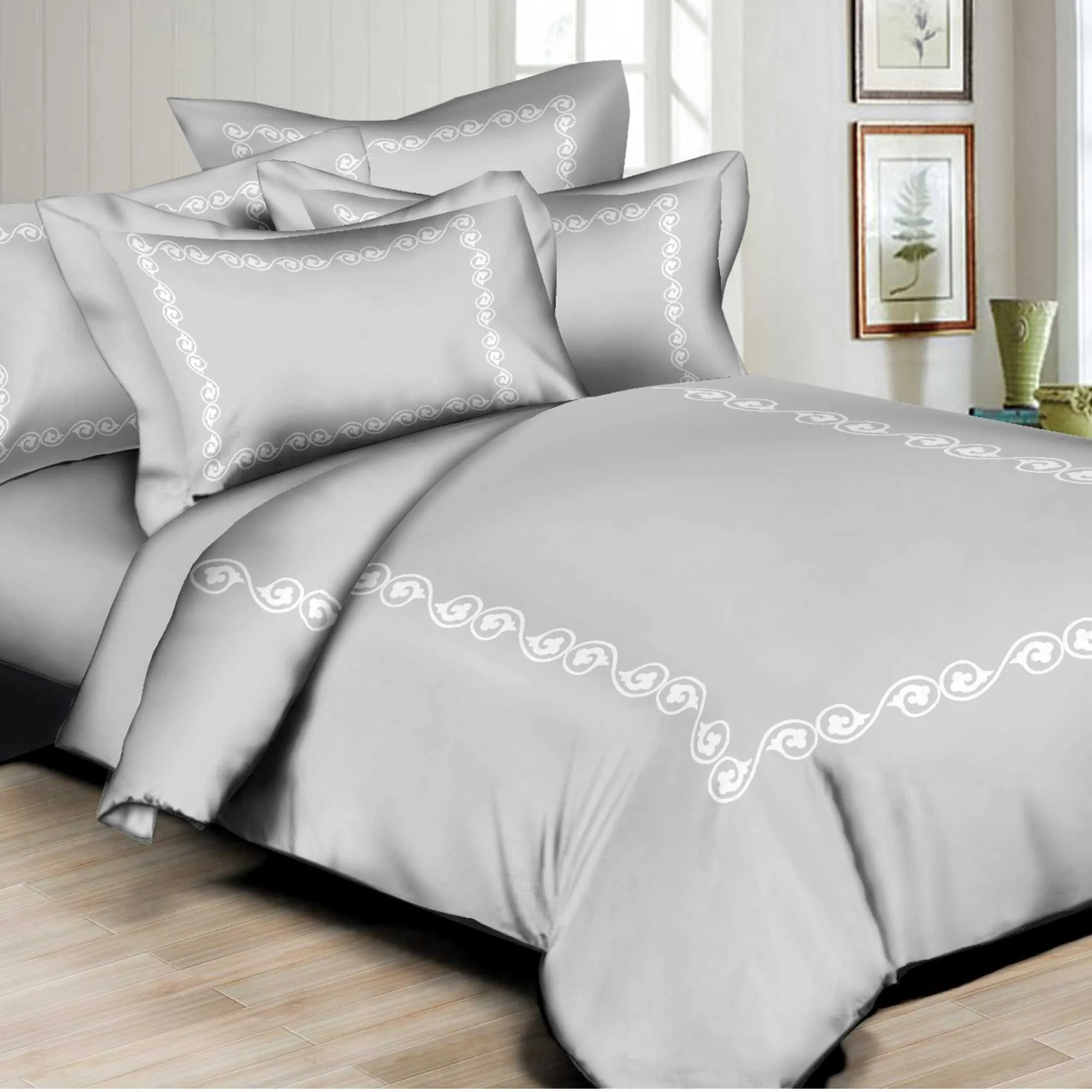 Duvet Set features Beautiful printed design, High quality Poly/Cotton Sateen, 300 thread count, Machine washable, easy care. Button closure at foot of Duvet cover.