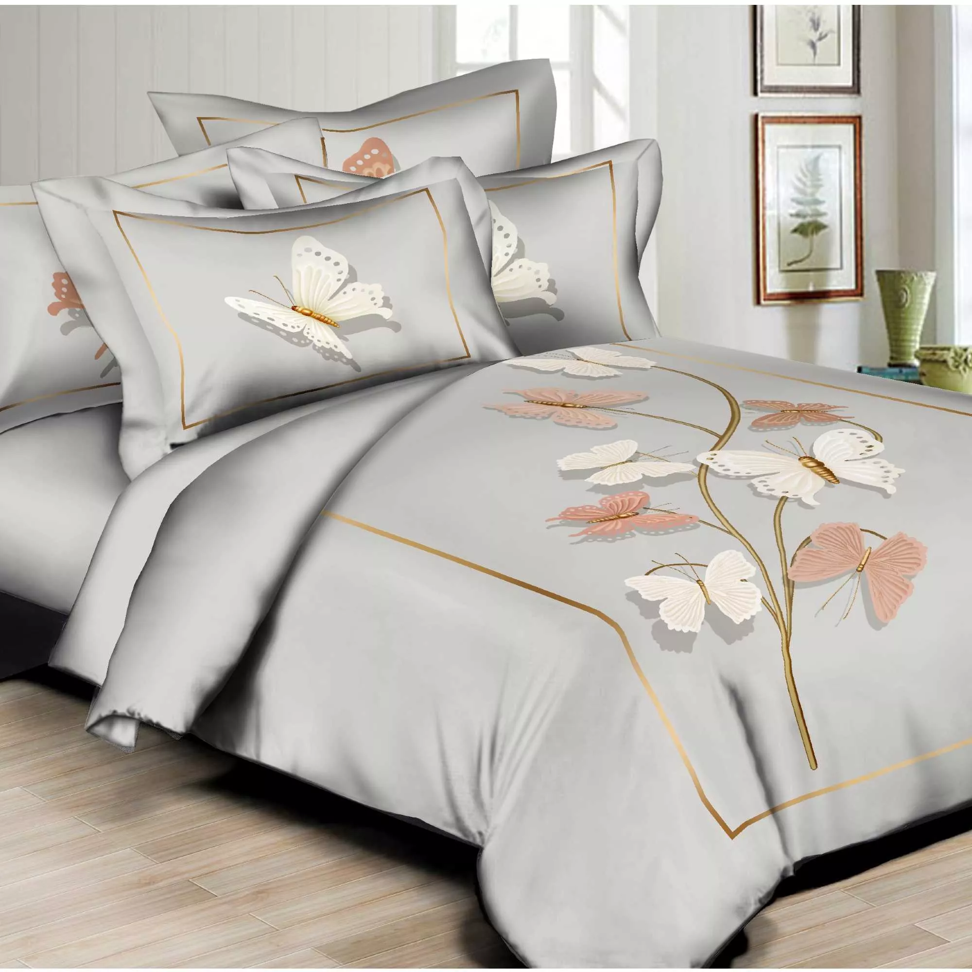 8 pc Duvet Set features Beautiful printed design, High quality 100% Cotton Sateen, 300 thread count, Reversible Duvet cover with coordinating sheets and envelopes. Machine washable, easy care wrinkle free cotton. Zipper closure at foot of Duvet cover.