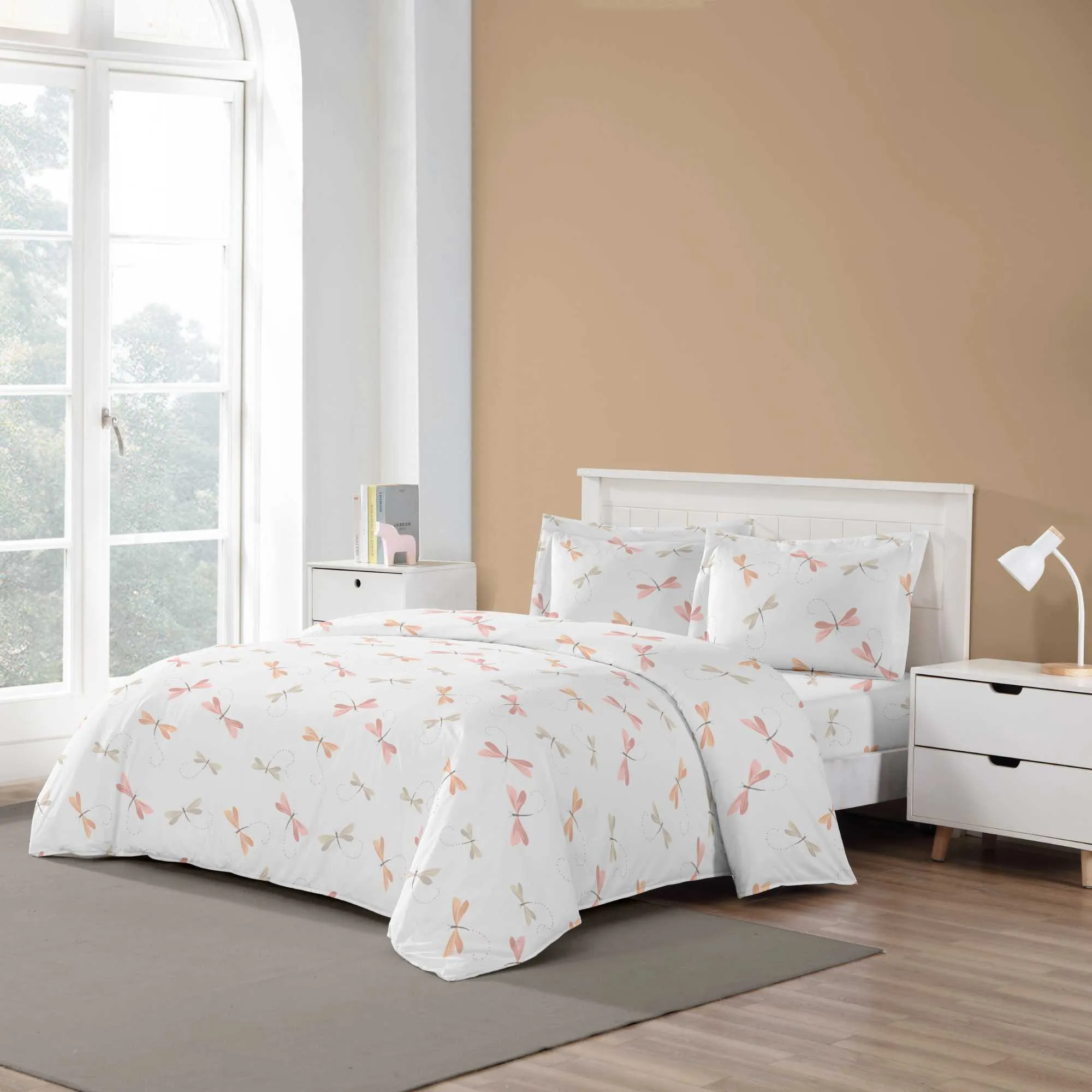 6 pc Duvet Set features Beautiful printed design, Poly/Cotton Percale, 200 thread count, Machine washable, easy care. Button closure at foot of Duvet cover.