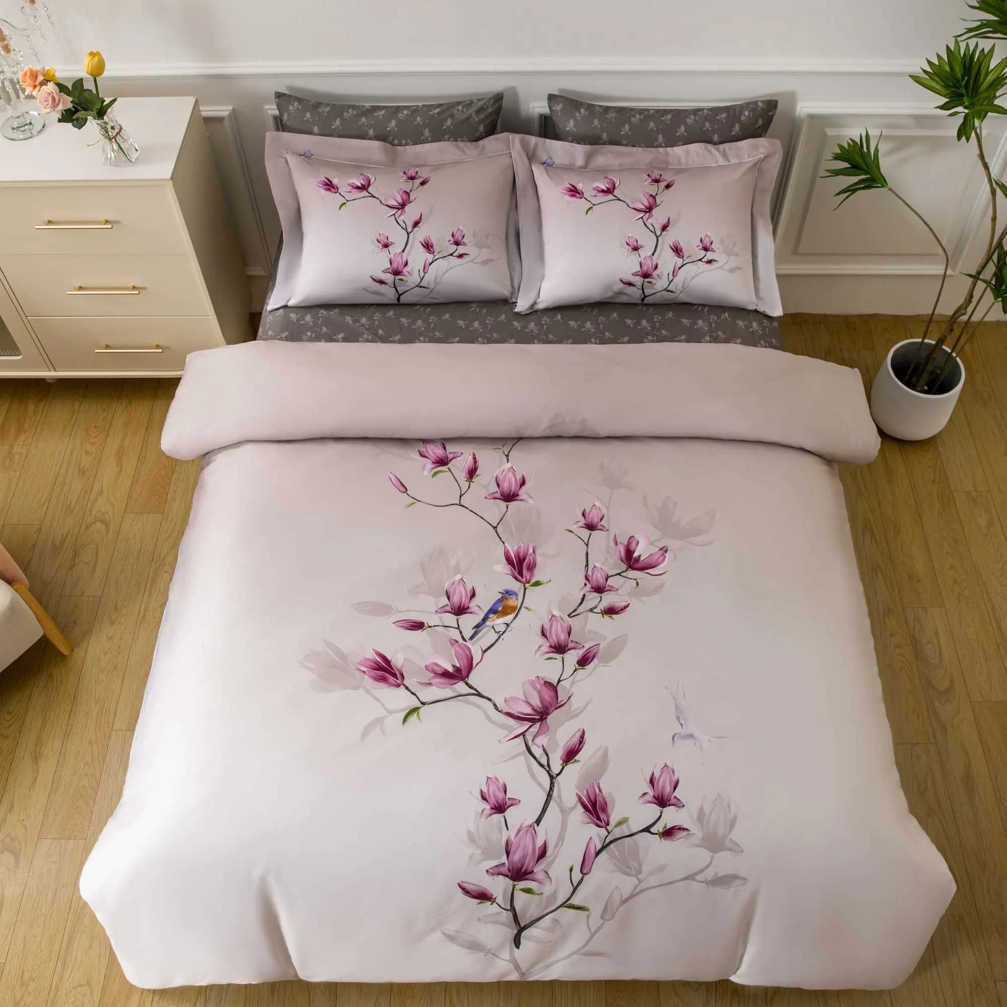 Luxurious 8 pc Duvet Set features Beautiful printed design, High quality 100% Cotton Sateen, 400+ thread count, Reversable Duvet cover with coordinating sheets and envelopes. Machine washable, easy care wrinkle free cotton. Zipper closure at foot of duvet cover and pillow shams.