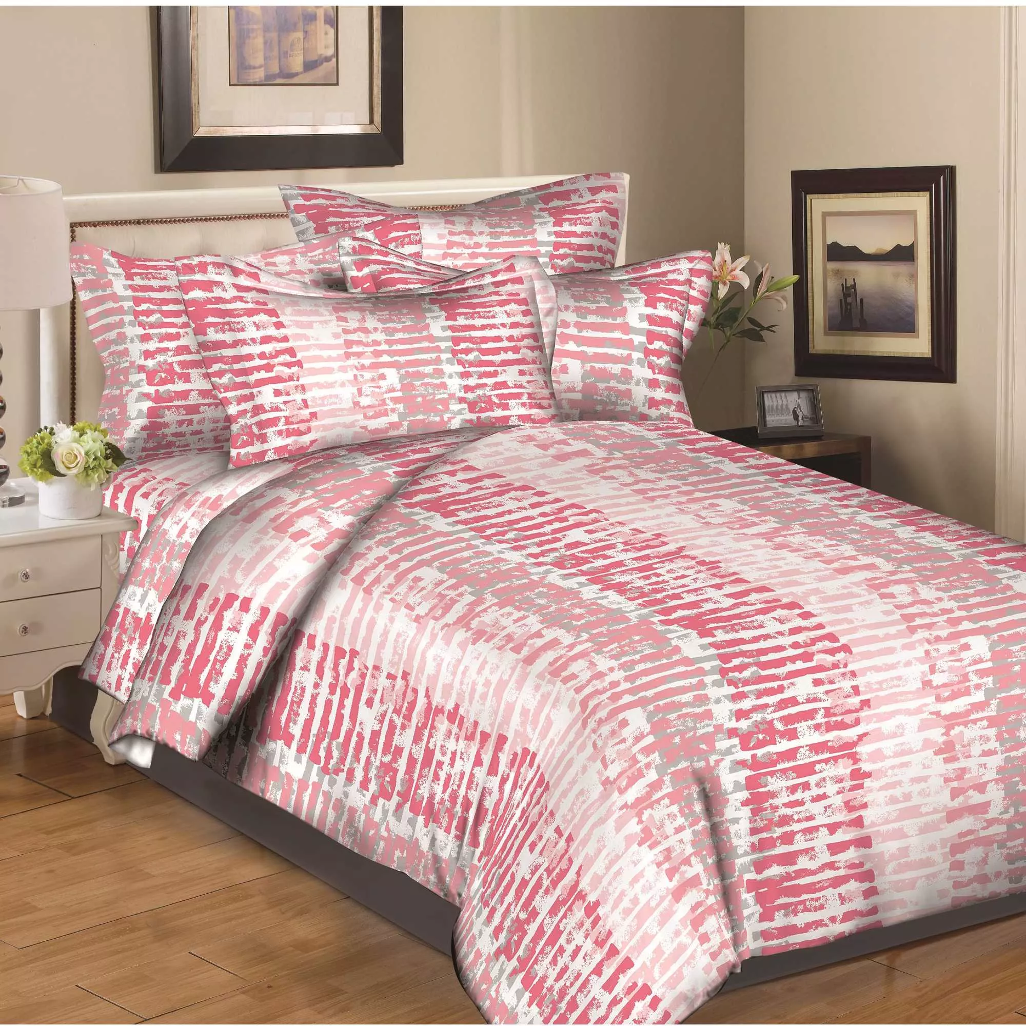 8 pc Duvet Set features Beautiful printed design, Poly/Cotton Percale, 200 thread count, Machine washable, easy care. Button closure at foot of Duvet cover.