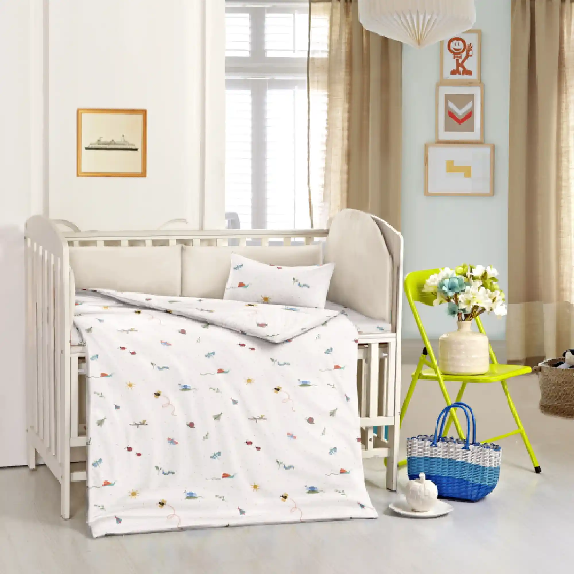 3 pc Crib Set features Beautiful Printed Design, Poly/Cotton Percale, 180 Thread Count, Machine washable easy-care Button closure at foot of Duvet cover