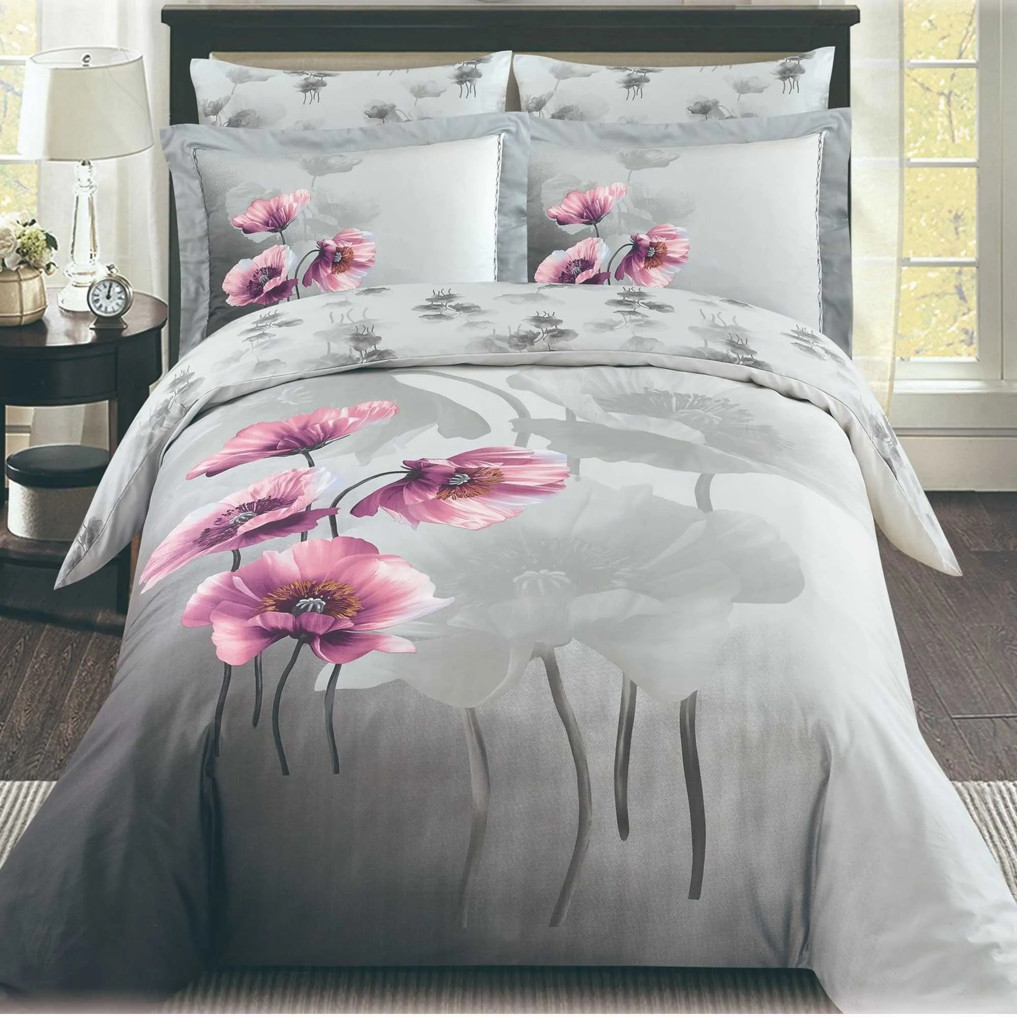 Luxurious 8 pc Duvet Set features Beautiful printed design, High quality 100% Cotton Sateen, 400+ thread count, Reversable Duvet cover with coordinating sheets and envelopes. Machine washable, easy care wrinkle free cotton. Zipper closure at foot of duvet cover and pillow shams.