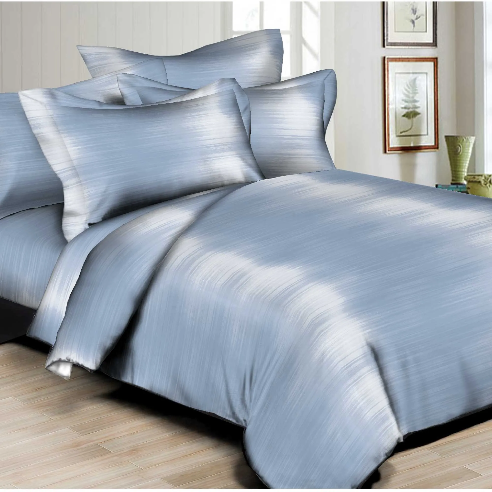 8 pc Duvet Set features Beautiful printed design, High quality Poly/Cotton Sateen, 300 thread count, Machine washable, easy care. Button closure at foot of Duvet cover.