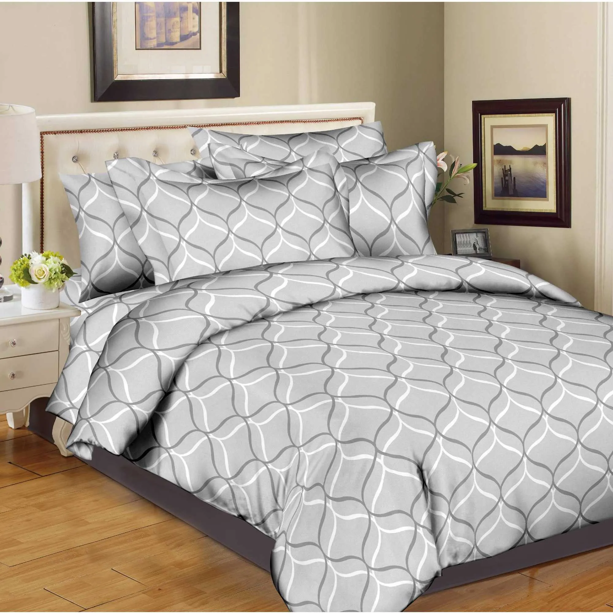 8 pc Duvet Set features Beautiful printed design, Poly/Cotton Percale, 200 thread count, Machine washable, easy care. Button closure at foot of Duvet cover.
