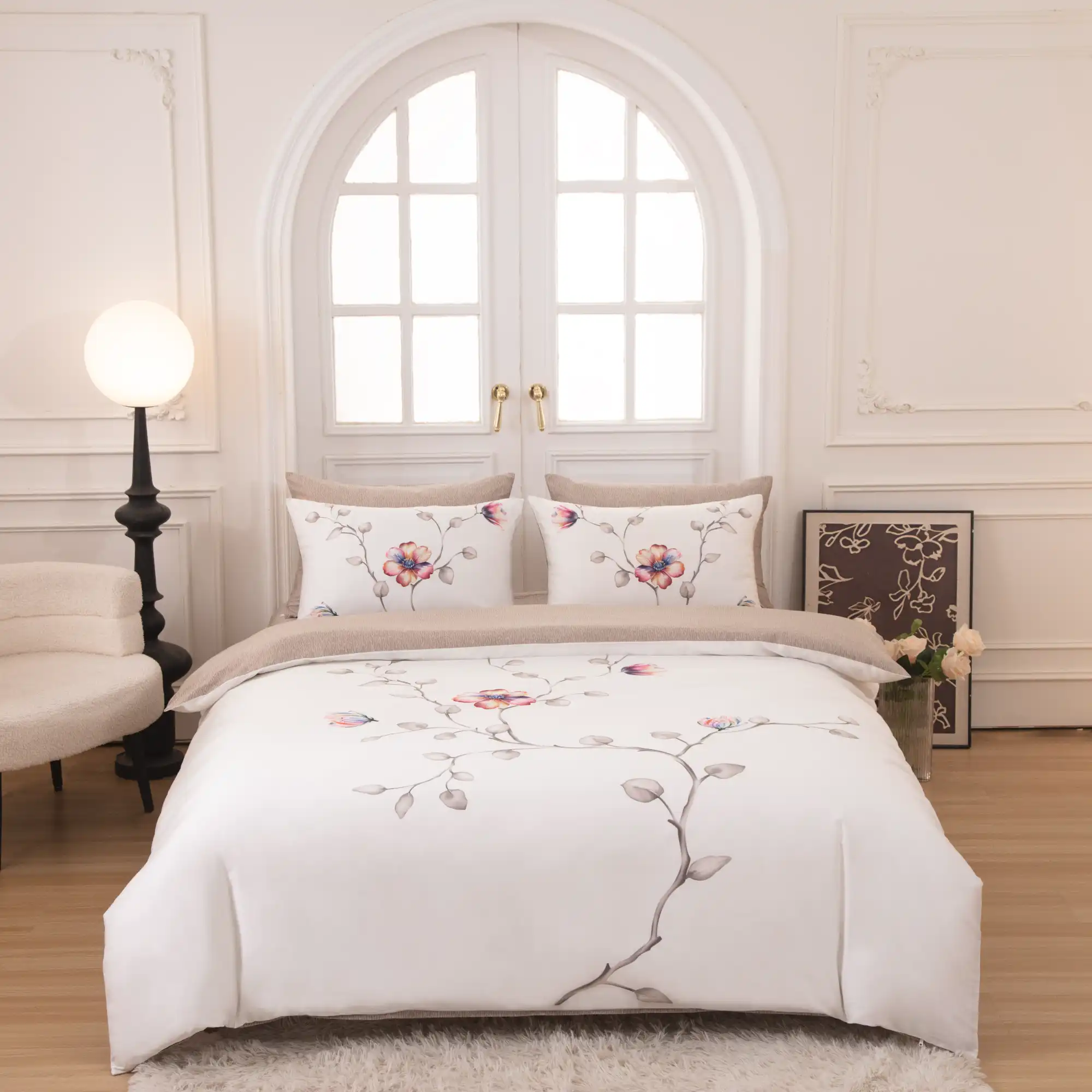 Luxurious 8 pc Duvet Set features Beautiful printed design, High quality 100% Cotton Sateen, 400+ thread count, Reversable Duvet cover with coordinating sheets and envelopes. Machine washable, easy care wrinkle free cotton. Zipper closure at foot of duvet cover and pillow shams.