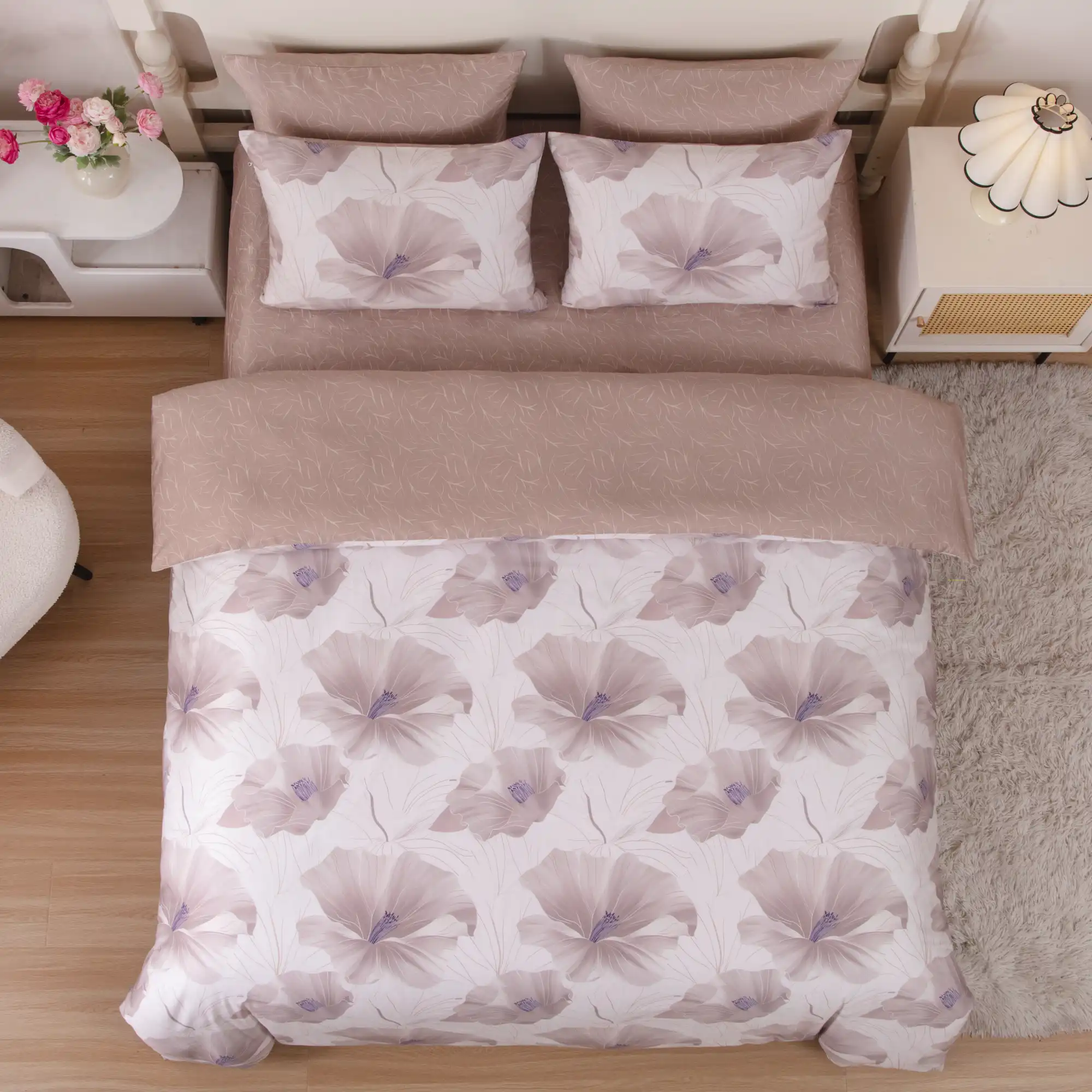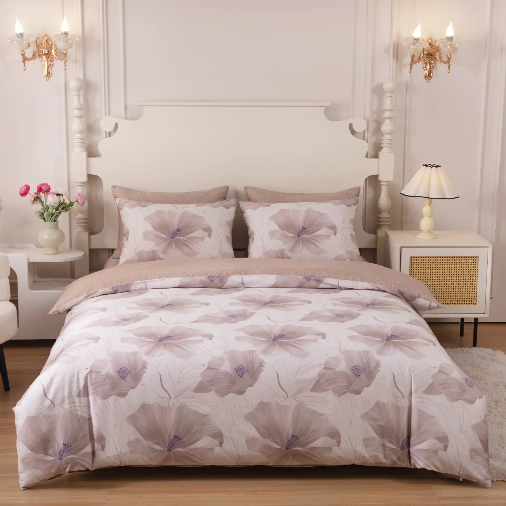 Luxurious 8 pc Duvet Set features Beautiful printed design, High quality 100% Cotton Sateen, 400+ thread count, Reversable Duvet cover with coordinating sheets and envelopes. Machine washable, easy care wrinkle free cotton. Zipper closure at foot of duvet cover and pillow shams.