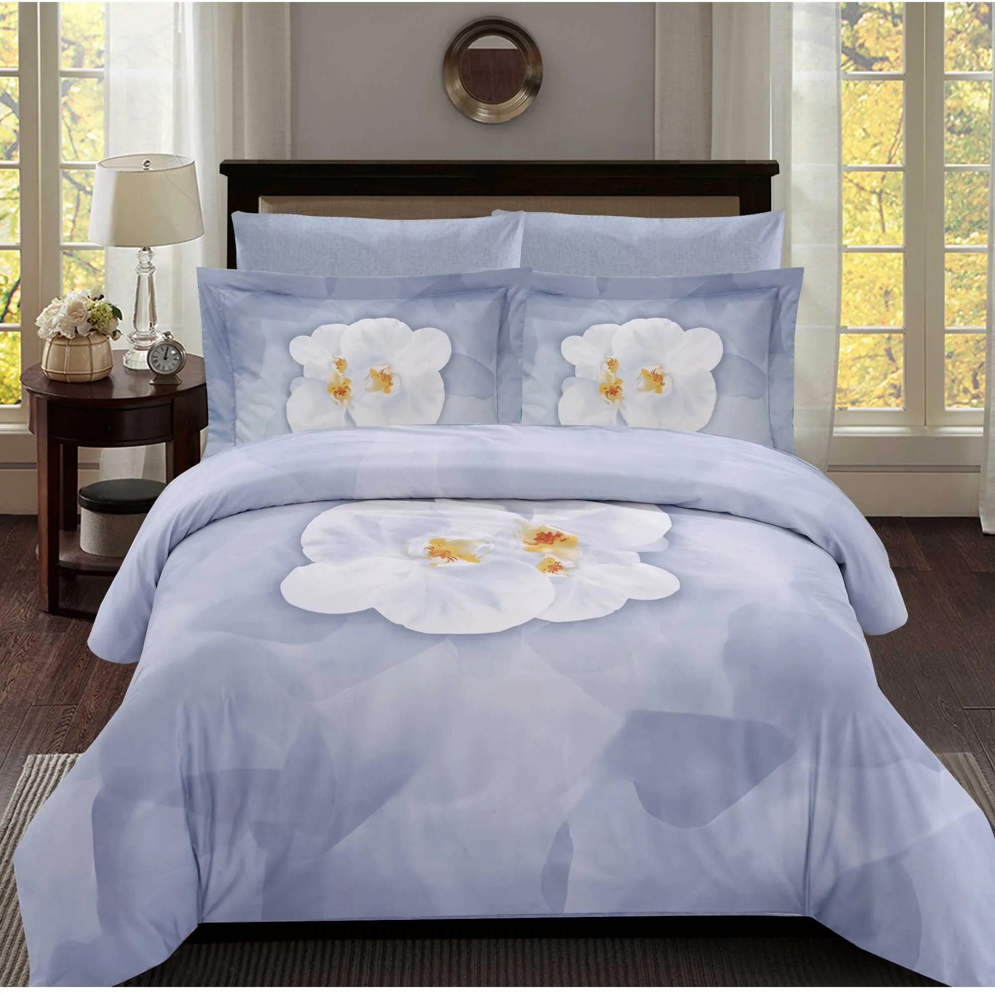 Luxurious 8 pc Duvet Set features Beautiful printed design, High quality 100% Cotton Sateen, 400+ thread count, Reversable Duvet cover with coordinating sheets and envelopes. Machine washable, easy care wrinkle free cotton. Zipper closure at foot of duvet cover and pillow shams.