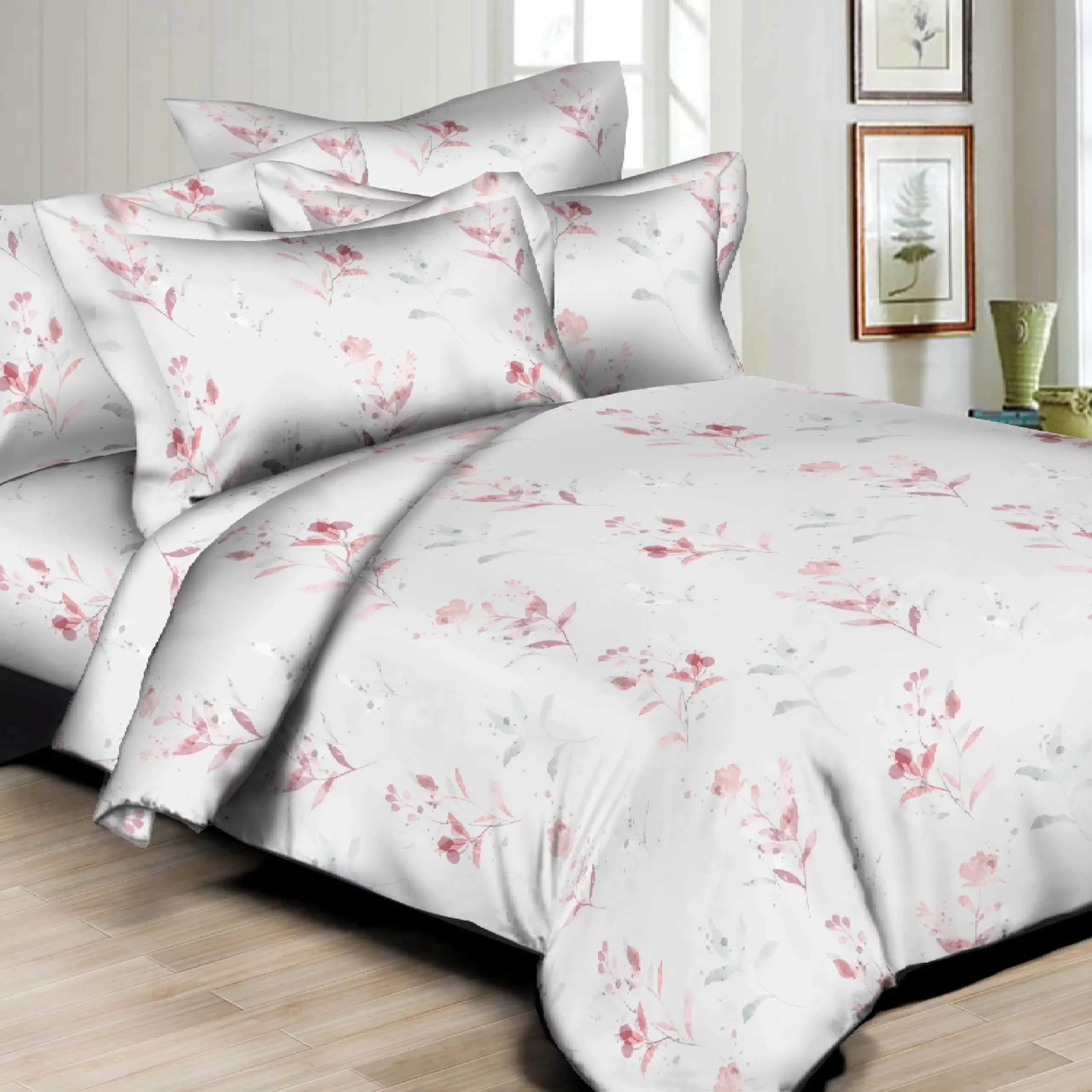 8 pc Duvet Set features Beautiful printed design, High quality Poly/Cotton Sateen, 300 thread count, Reversable Duvet cover with coordinating sheets and envelopes. Machine washable, easy care. Button closure at foot of Duvet cover.