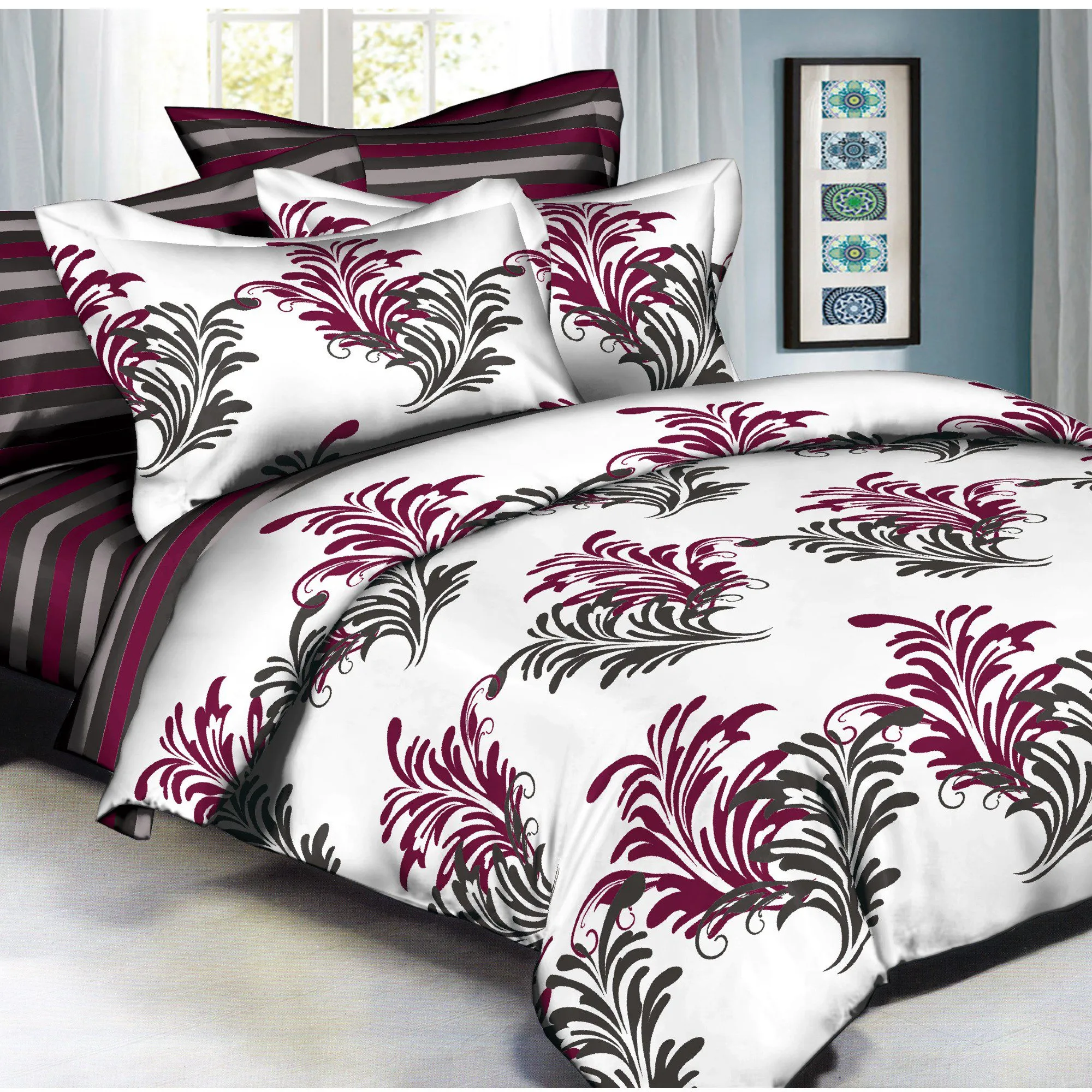 Duvet Set features Beautiful printed design, High quality 100% Cotton Sateen, 300 thread count, Reversable Duvet cover with coordinating sheets and envelopes. Machine washable, easy care wrinkle free cotton. Zipper closure at foot of Duvet cover.