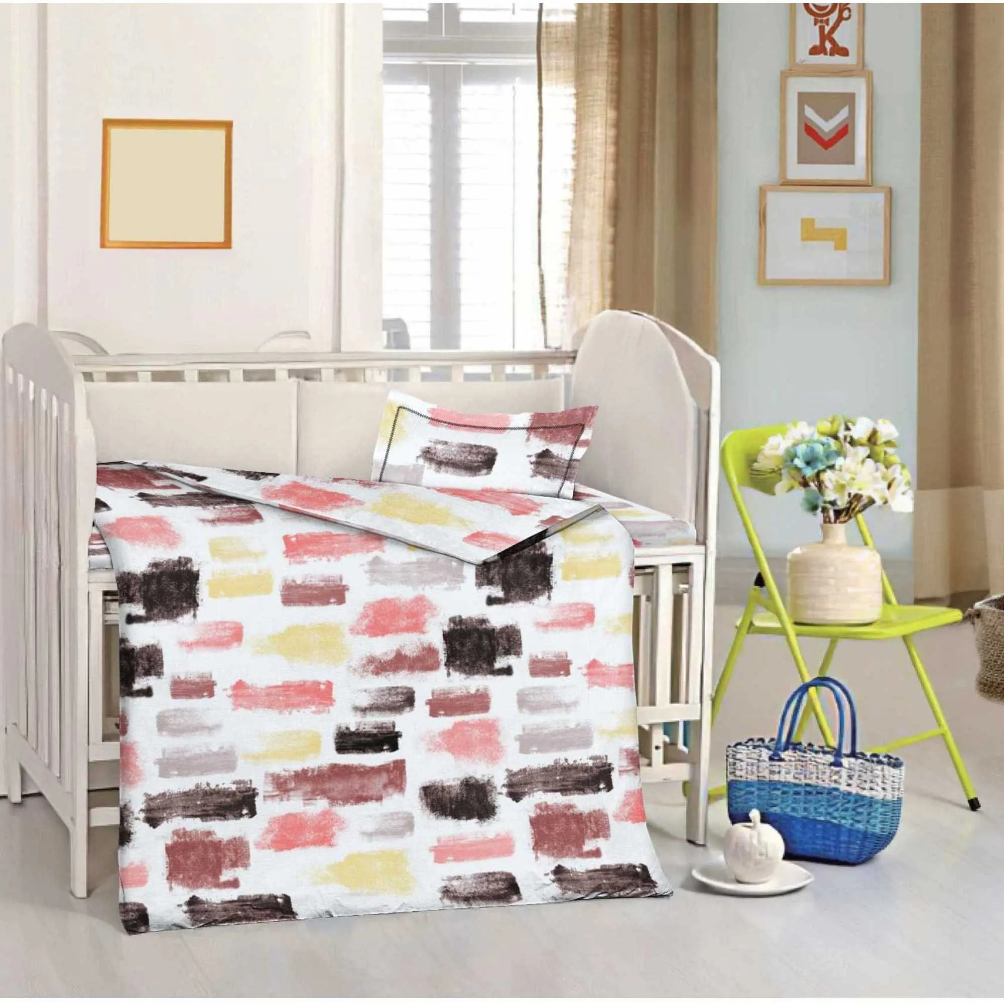 3 pc Crib Set features Beautiful Printed Design, Poly/Cotton Percale, 180 Thread Count, Machine washable easy-care Button closure at foot of Duvet cover