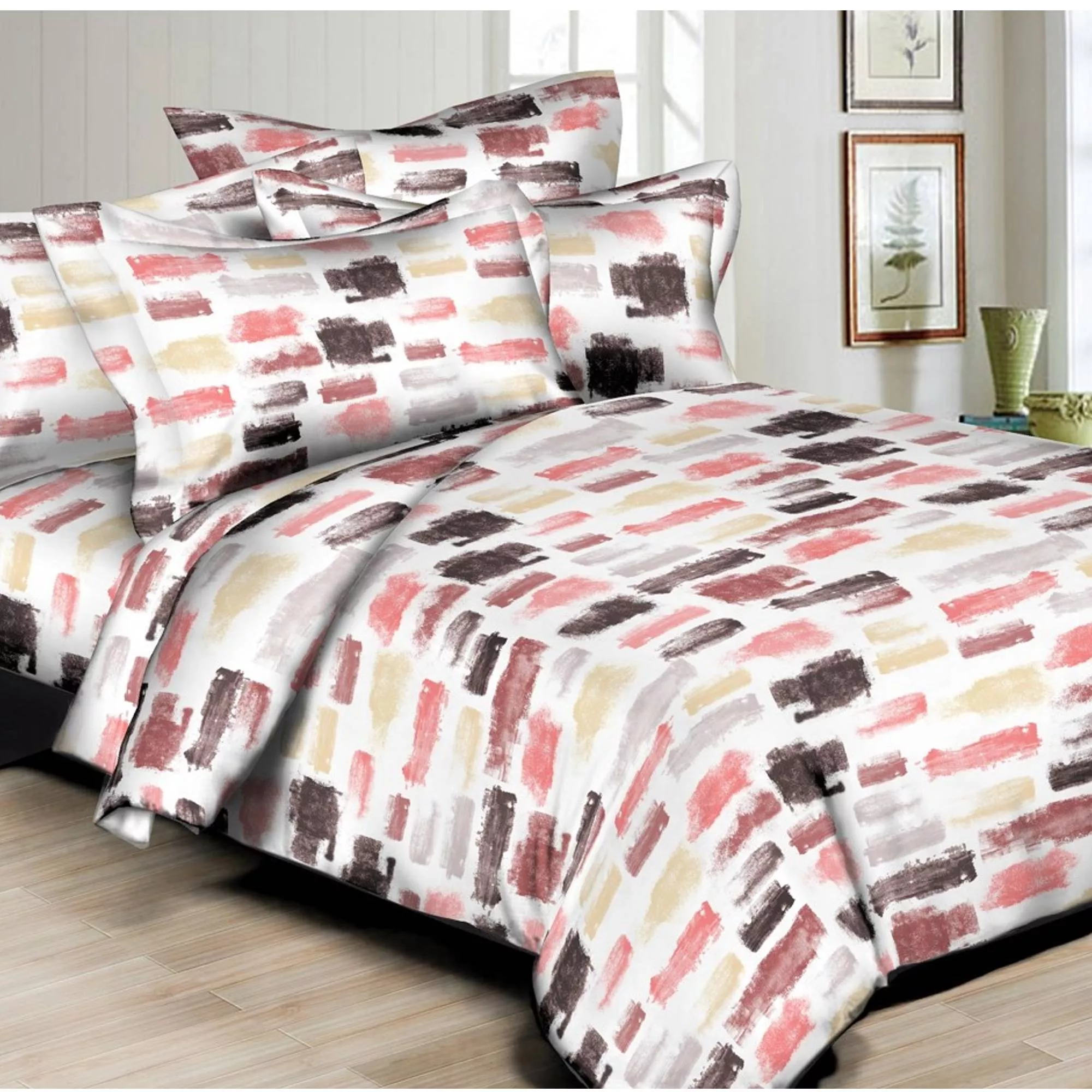 6 pc Duvet Set features Beautiful printed design, Poly/Cotton Percale, 200 thread count, Machine washable, easy care. Button closure at foot of Duvet cover.