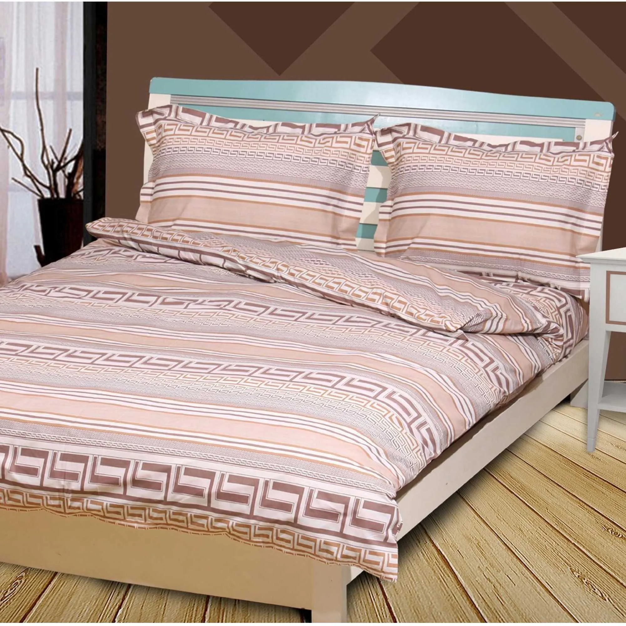 6 pc Duvet Set features Beautiful printed design, Poly/Cotton Percale, 200 thread count, Machine washable, easy care. Button closure at foot of Duvet cover.