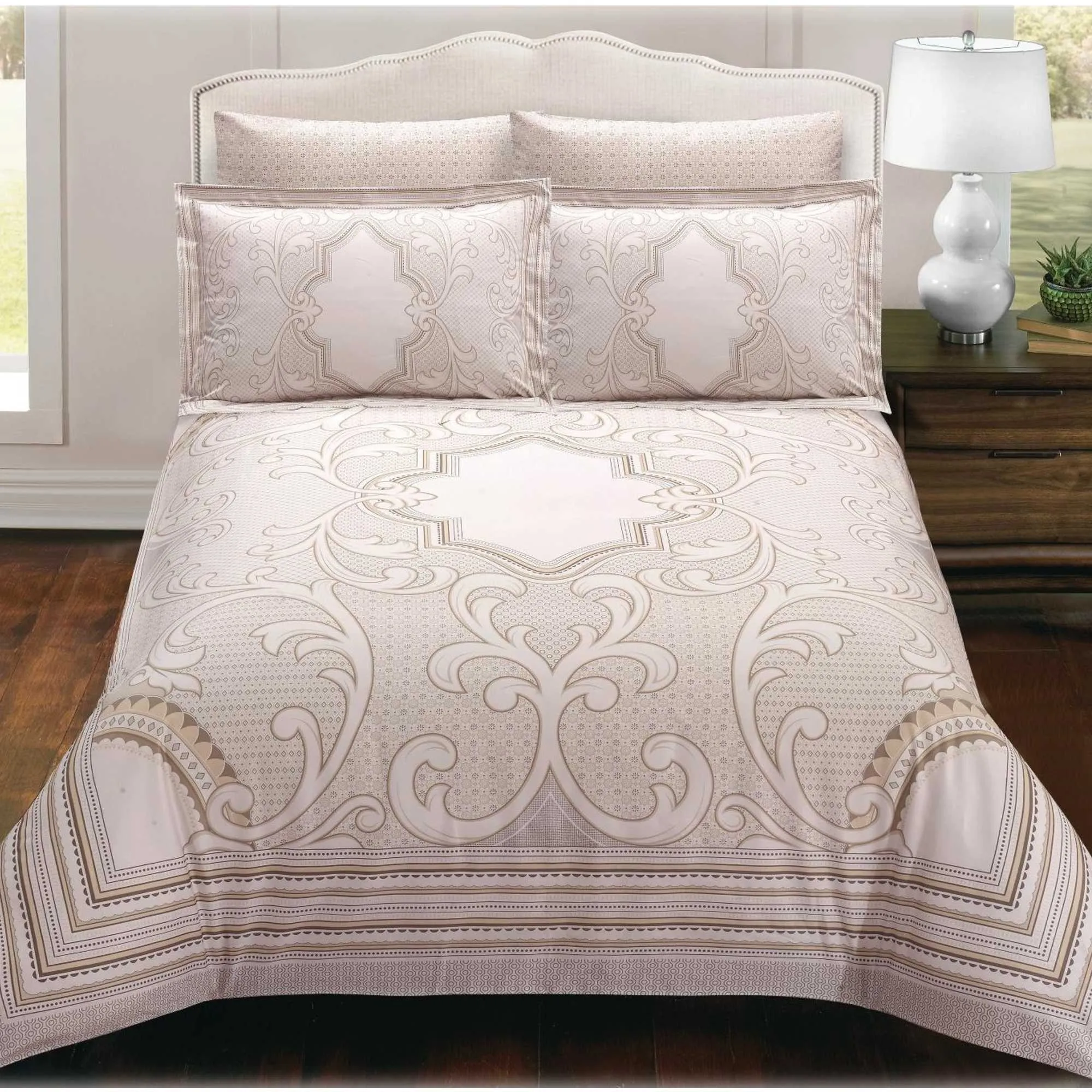 Luxurious 8 pc Duvet Set features Beautiful printed design, High quality 100% Cotton Sateen, 400+ thread count, Reversable Duvet cover with coordinating sheets and envelopes. Machine washable, easy care wrinkle free cotton. Zipper closure at foot of duvet cover and pillow shams.
