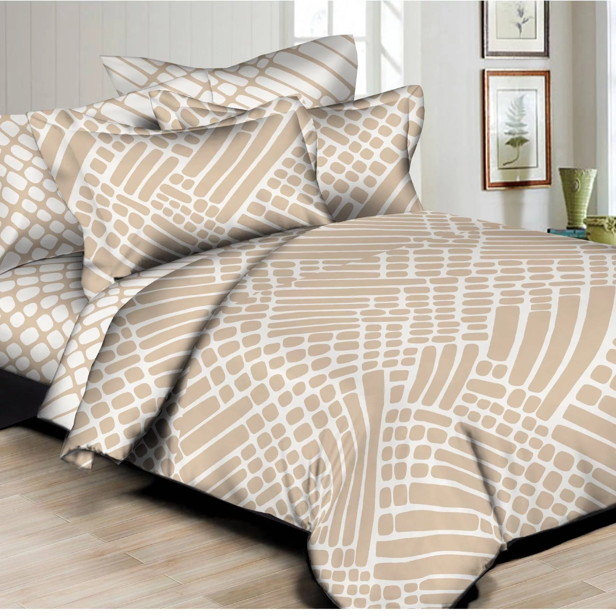 Duvet Set features Beautiful printed design, High quality Poly/Cotton Sateen, 300 thread count, Reversable Duvet cover with coordinating sheets and envelopes. Machine washable, easy care. Button closure at foot of Duvet cover.