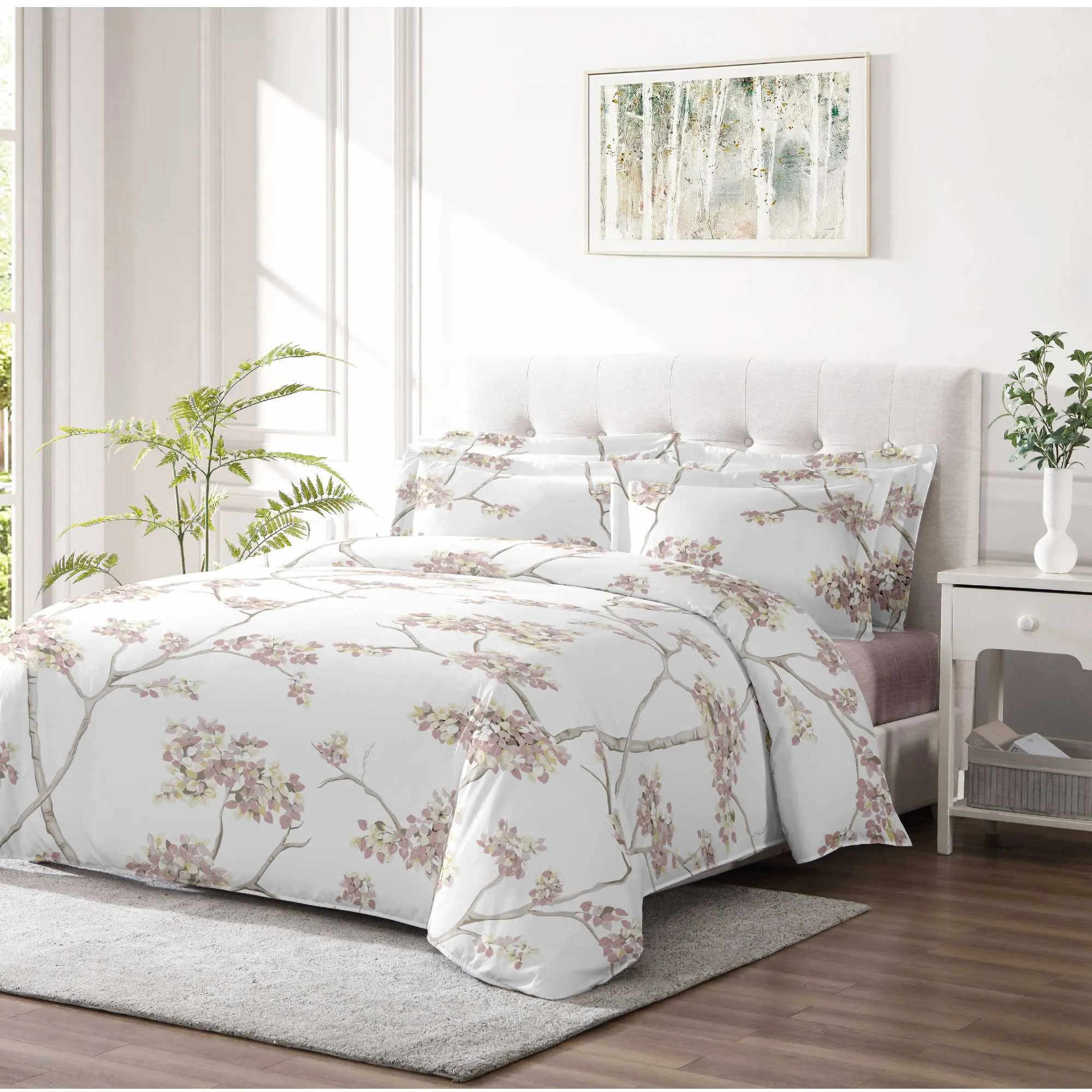 8 pc Duvet Set features Beautiful printed design, High quality 100% Cotton Sateen, 300 thread count, Reversible Duvet cover with coordinating sheets and envelopes. Machine washable, easy care wrinkle free cotton. Zipper closure at foot of Duvet cover.