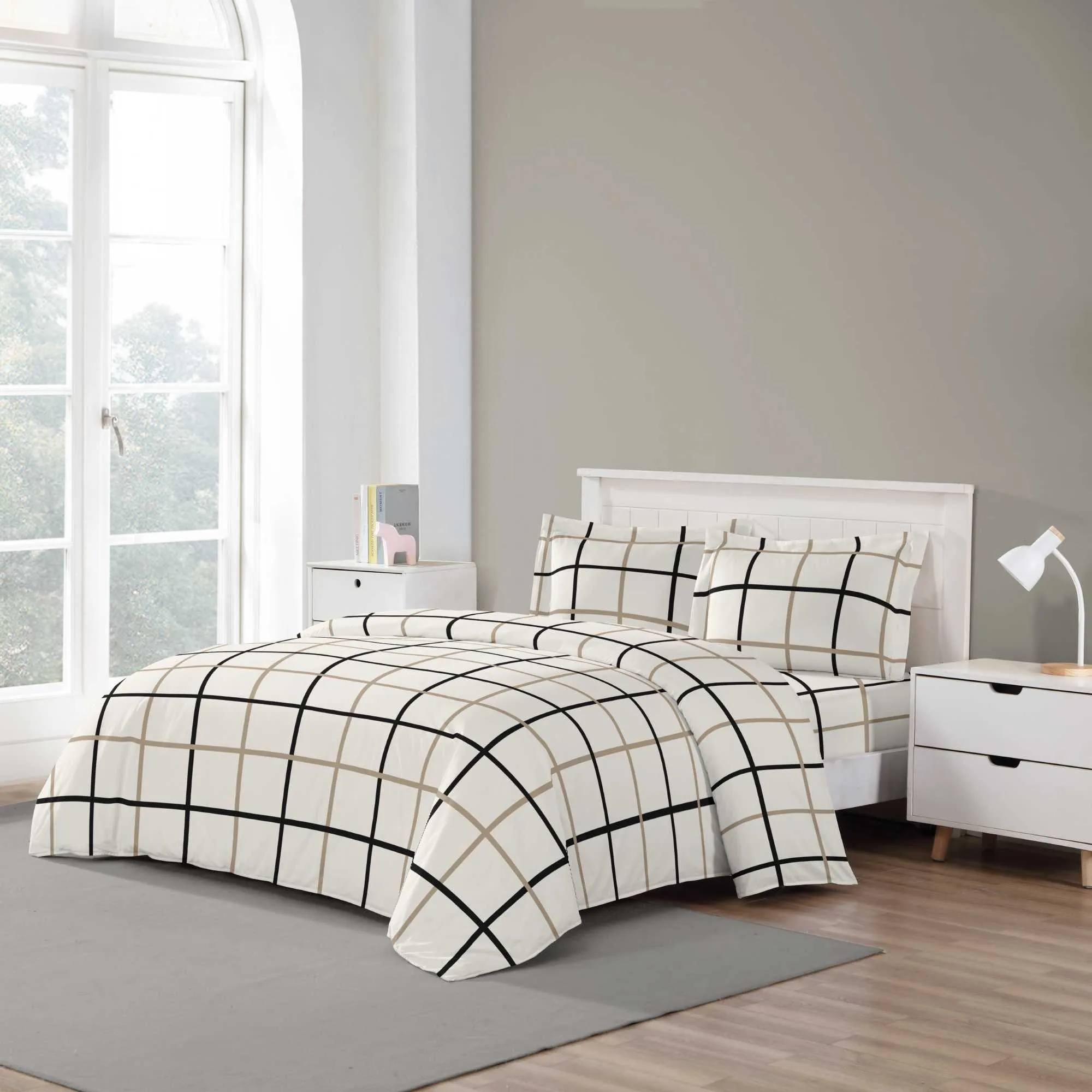 6 pc Duvet Set features Beautiful printed design, Poly/Cotton Percale, 200 thread count, Machine washable, easy care. Button closure at foot of Duvet cover.
